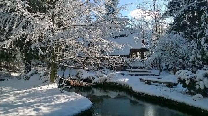 Domek. The fireplace is a top feature of this chalet. Boasting a private entrance, this chalet comes with 1 living room, 2 separate bedrooms and 1 bathroom with a bath and a hairdryer. Guests will find a stovetop, a refrigerator, kitchenware and a microwave in the well-fitted kitchen. The chalet also includes a barbecue. Featuring a terrace with garden views, this chalet also features a wardrobe and a flat-screen TV with cable channels. The unit has 5 beds. Domek - 5 osobowy. Powierzchnia pokoju ok.: 60 mkw.